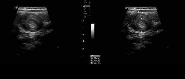 Solicita-se instilação de 2 tubos de Minilax com avaliação da evacuação insatisfatoria. Vinte minutos depois a criança começa com uma nova série de colicas, doloridas, é alojada na sala de tratamentos e infundem-se 0,4 ml Buscopan em bolus e. v. com resposta positiva imediata, solicitando-se uma hemograma e uma coleta urinaria por sonda. Mantida na sala de observação. Resultados: hemograma absolutamente normal, urina negativa para ITU. No entanto, as colicas voltam, e como já tinham passado 2 horas da ultima administração, repita-se a dose de buscopan e. v.. Depois de passar o ultimo episodio álgico, solicita-se uma nova lavagem intestinal, desta vez com Fleet Enema. Com essa segunda lavagem a criança evacua uma amostra de fezes pastosas, com muito muco e de cor discretamente avermelhada, que parece 'geleia de morango'. Passado um intervalo de tempo depois da segunda lavagem, as dores voltam, criança recebe a terceira dose de buscopan e é solicitado US de abdomen. Laudo: ' - Ausência de liquido livre na cavidade abdominal. Bexiga com capacidade normal, paredes finas e regulares e conteúdo homogêneo. Estudo ultrassonográfico dirigido para região abdominal, evidencia-se no presente momento formação em aspecto de 'lesão em alvo', na topografia do hipogástrio, medindo 2,5 x 3.5 cm, com camada externa de 0,8 cm de espessura, sem caracterização de causa secundária pelo método ecográfico.'