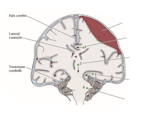 Analisem a imagem abaixo e associam os números com o tipo respectivo de herniação cerebral encontrada na descompensação da hipertensão intracraniana: