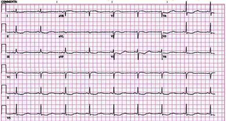 Discussão: O paciente apresenta achatamento de ondas P e principalmente da onda T, que aparece não só achatada como com aumento de duração, aparentemente por juntar-se a uma onda 'u'. Esta alteração é característica da presença de hipocalemia, que na verdade aparece inclusive no exame de sangue.