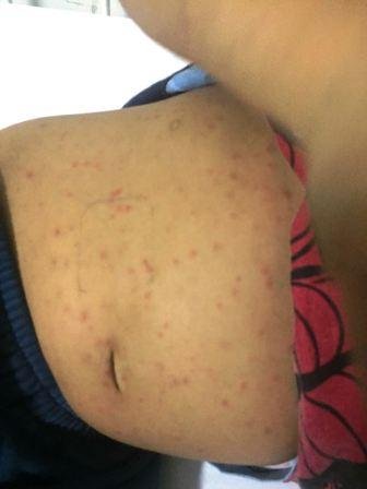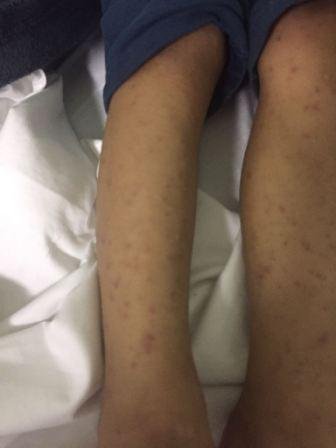 Na hora do atendimento, criança com prostração, febre 38.9ºC, exantema petequial disseminado praticamente corpo inteiro, Glasgow 15, eupneico (FR 28/min), PA 96/58 mmHg, frequência cardiaca 120/min. Abdomen globoso (ascite?), figado palpável á 2 cm abaixo da borda costal direita, baço á 3 cm borda costal esquerda. Edemas ++/++++ nos dois pés. Edema palpebral e facial leve. Linfonodos cervicais e inguinas palpáveis. Tempo de enchimento capilar 2 segundos.