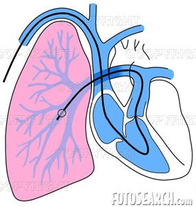 À medida que é introduzida no sistema venoso, a extremidade distal do catéter atinge primeiramente a veia cava superior e, em seguida, o átrio direito, o ventrículo direito e, finalmente, a artéria pulmonar.