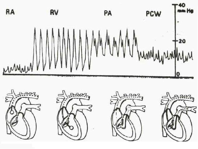 As maiores variaçoes de pressão acontecem, por exemplo, no ventriculo, e assim que as ondas de pressão vão aumentar visivelmente qundo o cateter vai chegar la. Quando vai subir na arteria pulmonar começa a diminuir a amplitude das contrações e assim para frente.