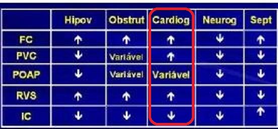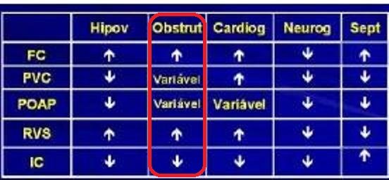 Infelizmente, nestas situações pode pensar que o debito esta baixo (porque a sintomatologia e desse jeito). O historico recente e muito importante para poder desvendar a causa do choque.- A mesma situação se encontra nas pacientes com tamponamento cardiaco. Aqui, o retorno sanguineo e medido pela componente restritiva.